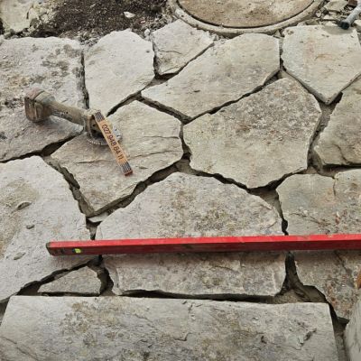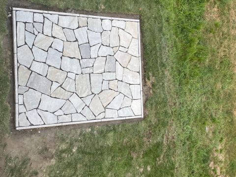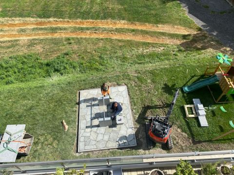 Freilegen des bestehenden Rasens. Bordüre setzen. Platten massgerecht zuschneiden und verlegen. Ins Niveau bringen. Ausfugen. Naturstein Tisch und Bänke versetzen. Abräumen und Reinigen.